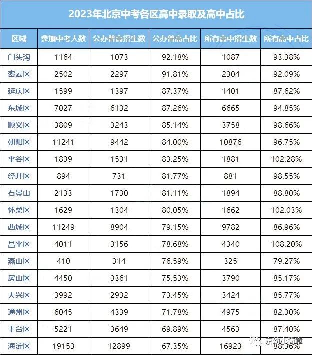 海淀区的公办普通高中录取率不到70%,因为海淀区还有不少教学实力强劲的民办学校和国际部等,所以算上统招民办和统招国际的学生人数后,海淀最终的所有高中普高录取率可以接近90%。