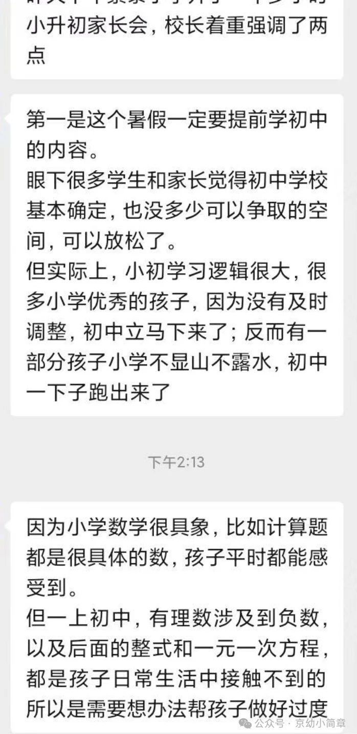 东城某小学的小升初家长会,强调暑假要提前学初中的内容。