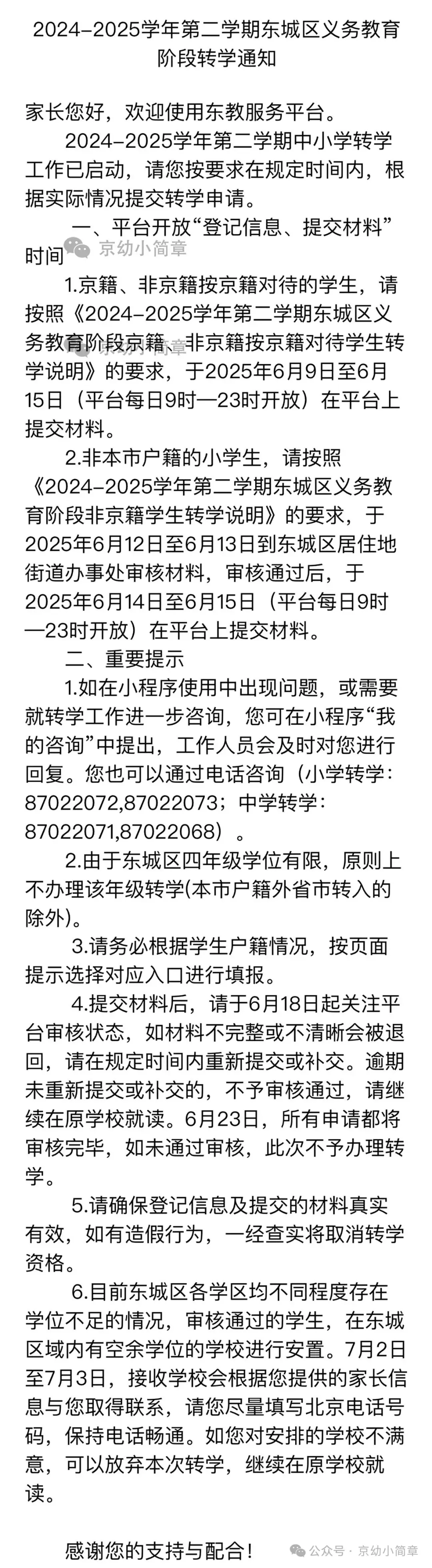 东城区2025年第二学期转学通知!