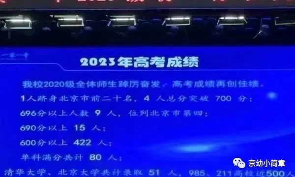 1人跻身北京市前二十名,4人总分突破700分; 696分以上人数9人,位列北京市第四; 690分以上15人; 600分以上422人; 单科满分共计80人; 清华大学、北京大学共计录51 人,985、211高校近500人