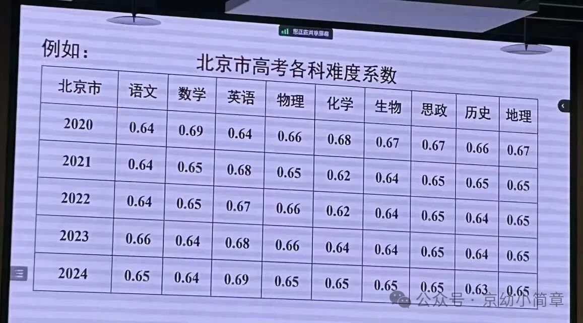 2020年是北京新高考元年,由于众所周知的口罩原因,各科难度系数也是历年最大的(难度系数越大,表示题目得分率越高,难度也就越小)。整体来看,新高考以来各科的难度系数基本上集中在0.65左右。