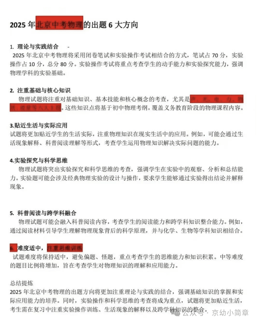 总结: 2025年北京中考物理的出题方向将更加注重理论与实践的结合,强调基础知识的掌握和实际应用能力的培养。同时,实验操作和科学思维的考查将成为重点,试题将更加贴近生活,考生需在复习中注重实验操作训练、生活现象的解释以及跨学科知识的整合。